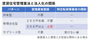 大家さんの法人化と賃貸住宅管理業法との関係は下表の通りです。